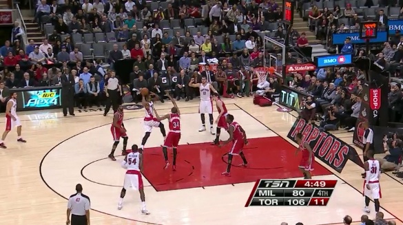 Check out these screen shots of two of the plays on which DeRozan had assists on Monday (he had seven by the way, and is now averaging 4.6 a game since the Gay trade, well above his career rate of 1.9, his 2.5 average from last year and his pre-trade mark of 2.7):