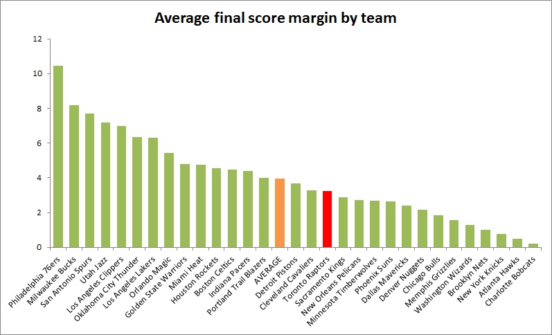 As mentioned, the Raptors ranked 17th in absolute average game margin, meaning their average game was slightly closer than the median and average team but not appreciably so.