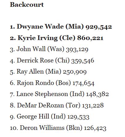 Playing beside a super star: With LeBron James return to Cleveland, teammates Kyrie Irving and Kevin Love are sure to register their highest vote totals ever. Conversely, though Chris Bosh and Dwayne Wade will benefit from their reputation they are likely to experience voter slippage.