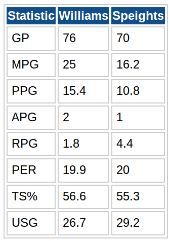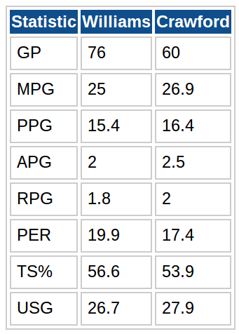 Both Crawford and Williams are equally poor defenders and they play the exact same role, so a comparison of their numbers is appropriate. The only appreciable difference between the two is how often Crawford is assisted on his 3-pointers (75 percent to 55 percent) which makes Williams’s production slightly more impressive. But then again, Crawford plays in the West. In a head-to-head comparison, Crawford has the edge in raw points per game, but Williams leads on a per-36 basis. Williams shoots more free throws and grabs more steals, while Crawford dishes out more assists. The only notable difference is PER, where Williams has him beat. But for the most part, their seasons are virtually indistinguishable.