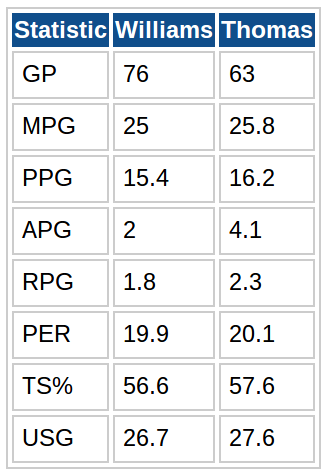 However, it circles back to games played. Thomas has only appeared in 63 games this season as compared to 76 for Williams. For that, Williams edges out Thomas. Otherwise it would be awfully close.