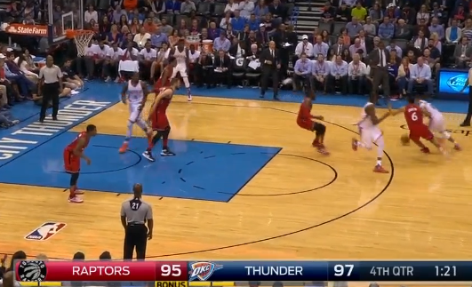 With the lead cut to four, the Raptors forced the Thunder into a late-clock scenario where Westbrook had to attempt a tough triple with Carroll right in his grill. The stop was made possible by Carroll and Joseph playing a Westbrook-Durant pick-and-roll expertly. Carroll shifts perhaps a hair too far toward Durant after Joseph has switched – a clean pass may have had Westbrook in a good position to attack a Carroll recovery closeout – but this is a strong, aggressive job by the defense.