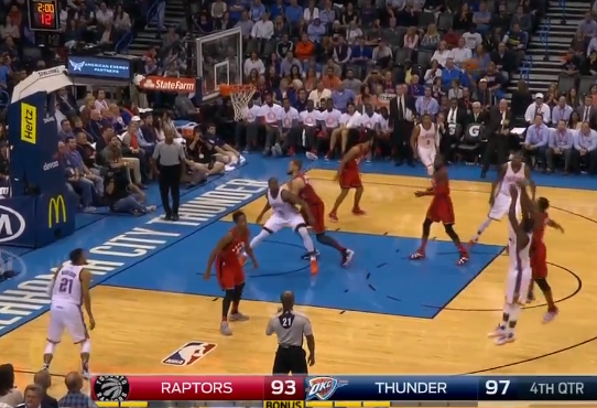 The game now tied, the Thunder went to Durant against Carroll. Valanciunas brought baseline help, and while the Thunder had some nice spacing, Durant’s location pinned in the corner with seven left on the clock left the Raptors comfortable to completely ignore the Thunder shooters. DeRozan helps way off of napalm-specialist Anthony Morrow to bang with Ibaka, allowing Valanciunas the freedom to help Carroll, while Joseph and Lowry can shade off their men a little further knowing they can close out aggressively if need be, since there’s little time for those shooters to make a subsequent pass or play.