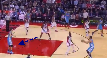 On this Danilo Gallinari three, the broadcast called Nogueira out for not being more up on the shooter. I don’t think that’s necessarily fair – he hedges aggressively on the initial screen (not the team’s general strategy but likely a tweak for Gallinari as the ball-handler), recovers to the nail where he’s supposed to be, and then at least gets a hand up when Gallinari gets the ball back. Nogueira isn’t well-served guarding stretchy bigs (Mirza Teletovic says hello) and he could have contested more aggressively despite the distance of the three, but this wasn’t all that bad.