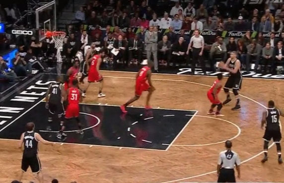 The Nets may even over-pass here, with the ball going Johnson-Bogdanovic-Johnson-Young, enough so that the Raptors can mostly get back in position,but Young has a clean look.