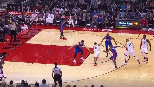 In one instances, Patrick Patterson comes up high to set the initial screen for Joseph while Biyombo settles in just above the elbow. Marcus Morris drops off of Patterson as if to guard a standard high pick-and-roll and prevent Joseph from getting into the lane, which itself could create an opening for a Patterson pop outside the 3-point line. Biyombo steps up to set the second screen on Reggie Jackson while Andre Drummond similarly drops back.