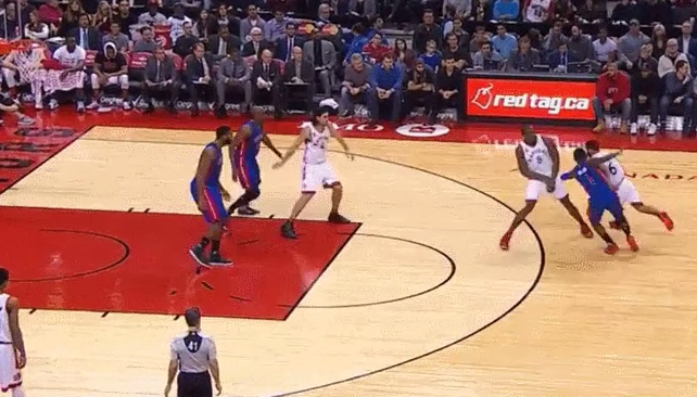 Later, the Raptors run something similar with Biyombo and Patterson screening. Joseph loses the handle some but still manages to exploit the chaos that ensues from the initial Drummond switch for a short jumper. Even before Joseph gets the ball, the Raptors have Jackson moving and guessing a ton.