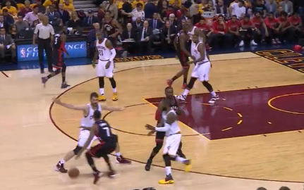 Lowry goes the long way around Love but Irving is still a little slow to get back into his lane, and Lowry’s able to pull up in the paint. Patterson drifted to the short corner, which left Love to split the difference, essentially guarding nobody. If he didn’t get the edge on Irving, Lowry could have had Patterson open for a wing three.