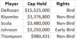 Having those expiring contracts doesn’t necessarily give the Raptors cap space. Until the rights to those players are renounced, the players have cap holds, which count for the purposes of the salary cap to prevent teams from signing a bunch of free agents with cap space and then signing their own guys. In many cases, ordering signings in that way can still be beneficial (which is why in many scenarios, it will make sense for the Raptors to wait to re-sign DeRozan to prevent his cap hold from increasing), but for the Raptors, they may need to renounce some rights to clear up space.