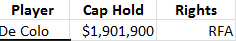Yes, that Nando De Colo. The Raptors still own his rights in restricted free agency (and his Early Bird rights), even though he just signed another multi-year deal with CSKA Moscow. If the Raptors want to retain his RFA rights, they’ll need to issue him a $1.83-million qualifying offer by June 30, one that will stay on the books all summer (note that I used his cap hold amount rather than his $1.83-million qualifying offer) unless the Raptors rescind his rights.