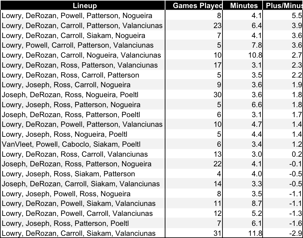 Meanwhile, the club’s most efficient lineup at +5.5 of Lowry, DeRozan, Powell, Patterson and Nogueira was used in only 8 contests and only 4.1 minutes in those games (13th most used in both categories). It’s the team’s best iteration by a wide margin (1.6), leading to the question of why it doesn’t figure more prominently.