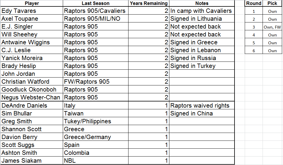 While it my not have been all that realistic to expect Toupane back for a third tour of duty with the 905, the news continues to thin them out in an official capacity. Here’s a look at their rights sheet at present: