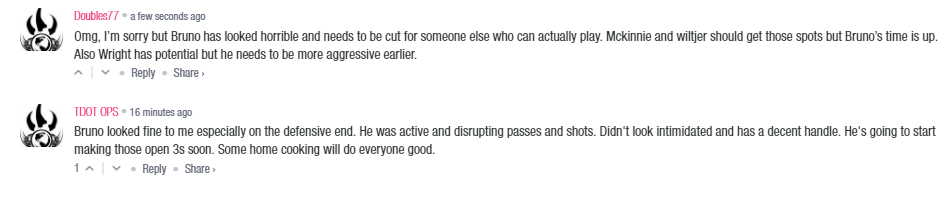 ![]() C | L. Nogueira14 MIN, 0 PTS, 3 REB, 0 AST, 0 STL, 0-0 FG, 0-0 3FG, 0-0 FT, 2 BLK, 1 TO, -5 +/- Tough one for Bebe, who did a few small things well – some really stout drag screens, scattering back to bigs on short-rolls after hedging, protecting the rim – but seemed to be getting an earful from Casey at every turn, including on a back cut and fouling on a three. Neither center has run with this spot yet, and it could be fluid entering the year. | ||||||||