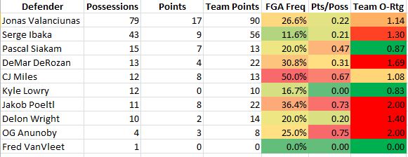 In Game 3, James relentlessly hunted switches on to C.J. Miles, as an example. Miles is a below-average defender but has at least been one of Toronto’s most consistently effortful performers on that end, and he’s actually had some successful possessions against James. He attacked DeMar DeRozan, too, and to his credit DeRozan had a few strong defensive stands (the inconsistency there is maddening; he’s clearly capable of defending well when locked in). It’s telling, though, that the Cavaliers know ahead of time they’ll be able to draw the switch and are seeking it with such regularity. Here’s the same chart for Love, from my piece at The Athletic yesterday linked above.