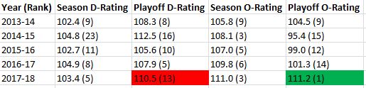 In general, the Raptors have done a better job in this series than in recent years. It’s been a very close series, by just about any way of looking at it other than “3-0.” And there’s a genuine improvement in the primary area the Raptors thought they needed to get better in for this matchup. The entire focus of their culture reset was on the offensive end of the floor, and their top-five offense from the regular season has completely carried over to the postseason for the first time. They’re actually scoring a fragment of a point more per-100 possessions despite the Wizards being a roughly average defense, the Cavaliers stepping up their play a bit on that end (Love has been super under-rated on that end when it’s not Lowry attacking him, by the way).