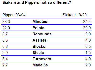 If anyone is going to be Toronto’s 93-94 Pippen, it will be Siakam. He can dominate on both ends of the floor, and with a new jumper that is apparently faster and more reliable on the move, Siakam will be difficult to stop. Yes, it’s been preseason, so caveats apply, but Siakam has put up massive numbers while not appearing to try very hard. In fact, this means nothing, but it’s fun: look at the similarities between the per-game numbers of Pippen in 93-94 and Siakam’s 19-20 preseason.