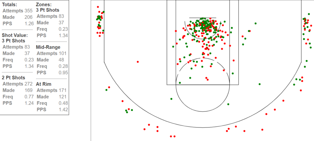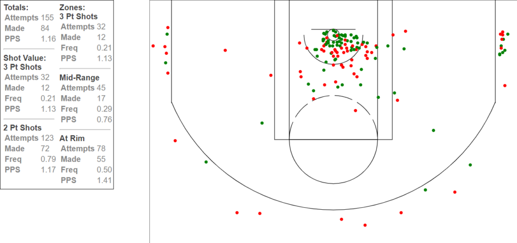 Both shot charts, aside from quantity, are similar in both frequency and accuracy; the only real difference pointing to Siakam’s higher points per shot alongside Lowry and Leonard was that his 3-point percentage was higher. That could be attributable to a small sample size, but either way, Siakam was a dominant scorer last year even without Lowry and Leonard off of whom he could feed. Siakam will not struggle this year without a tier-one scorer beside him. He can create for himself despite stagnant teammates, isolating against fantastic defenders.
