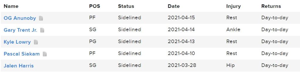 Let’s look at the current injury reports for three teams. The Raptors did get fined for playing fast and loose with injury reporting, so take this with a truckload of salt: