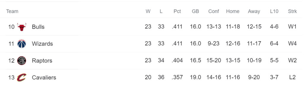 I always look at the loss column so the Raptors are a game back of the Bulls but since the Bulls hold the tie-breaker, it’s really two games back. The Raptors hold the tie-breaker with the Wizards so a tie in the W column will be enough for the Raptors to push ahead.