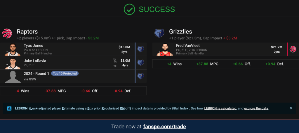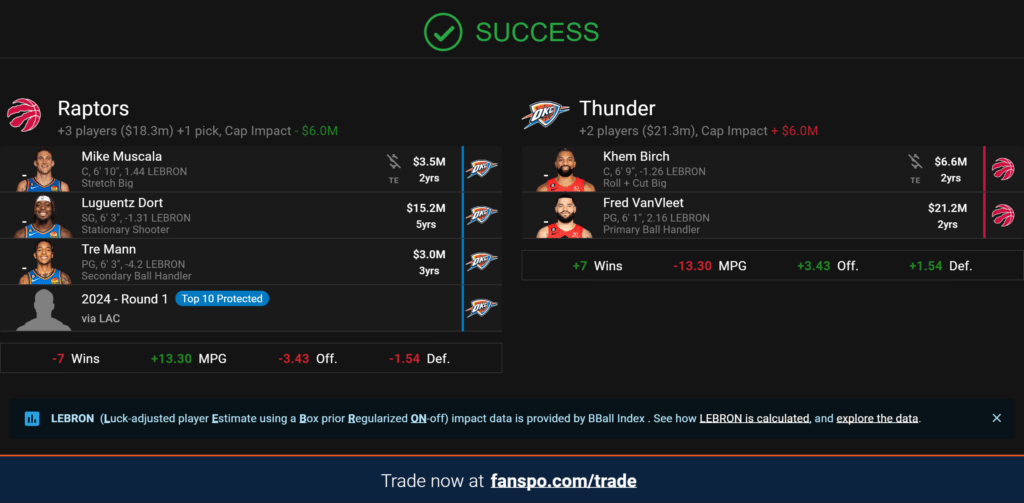 Tre Mann is an intriguing add-on. He has struggled in his sophomore season. But with a lesser role, he can come off the bench and let it fly for a few minutes – Bones Hyland style – Nurse-allowing, of course. Mike Muscala is salary filler and won’t help Toronto’s size issue, but he can space the floor (38% on 3 three-point attempts a game). Enough said.