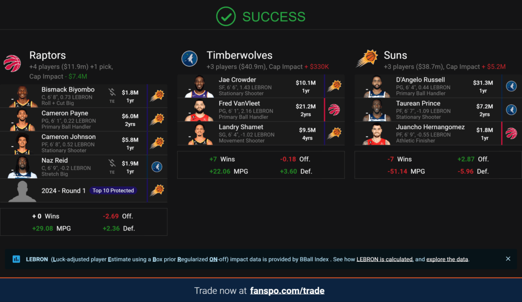 Toronto gets off some money. They also get Naz Reid – all of Raptors Twitter rejoices – as a versatile, shooting big man, Cam Payne as a stand-in point guard, and they make up for Freddy’s lost shooting with wing Cameron Johnson. The Raps would have to finagle roster size, but it’s essentially a 3:1, building out a real bench to work with.