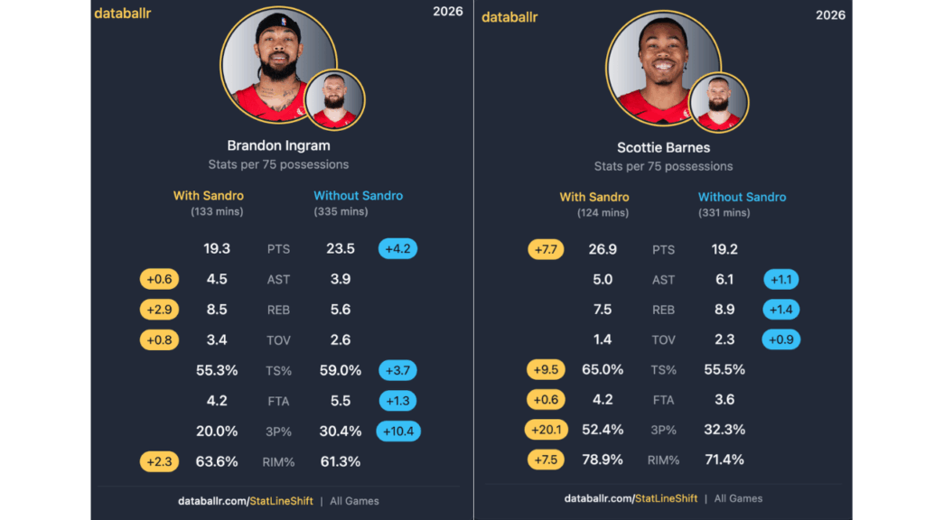 And as far as being a conduit for the Raptors’ best players, look at how Mamu’s presence impacts both their efficiency and output so far this season: