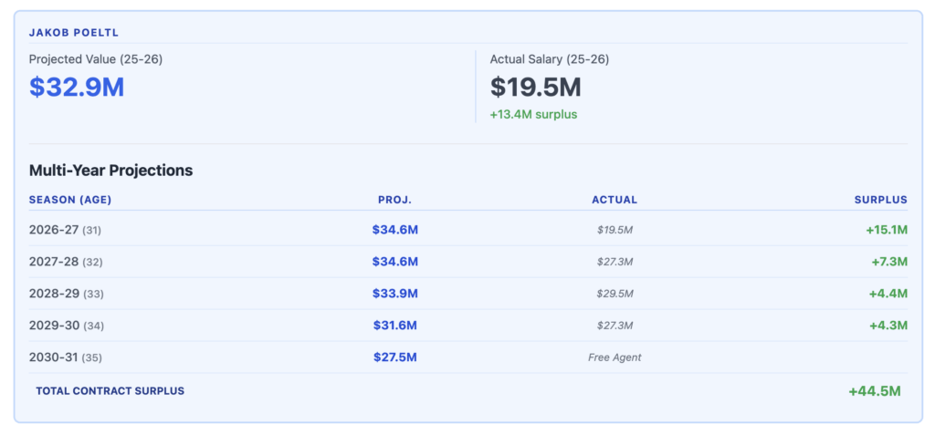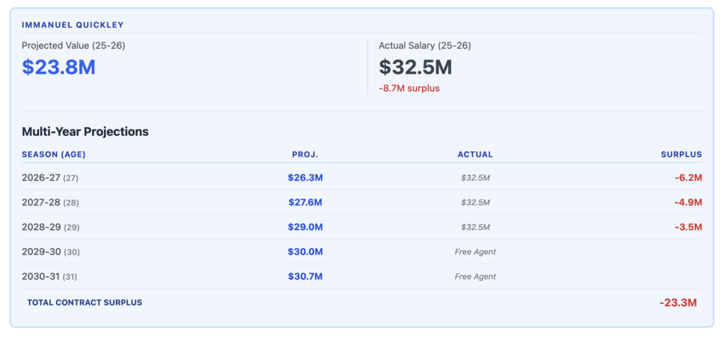 Outside of that, Immanuel Quickley’s $32.5 million AAV is viewed as one of the more negative-value deals across the NBA, while Jakob Poeltl’s contract holds plus-value (by advanced metric models) but is complicated given his lingering health concerns.
